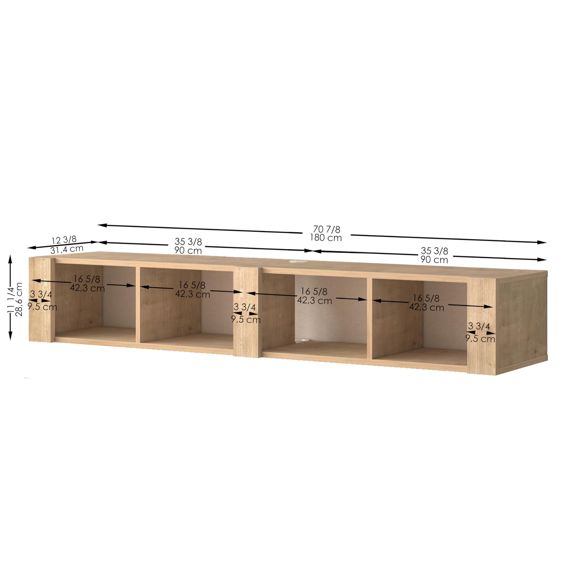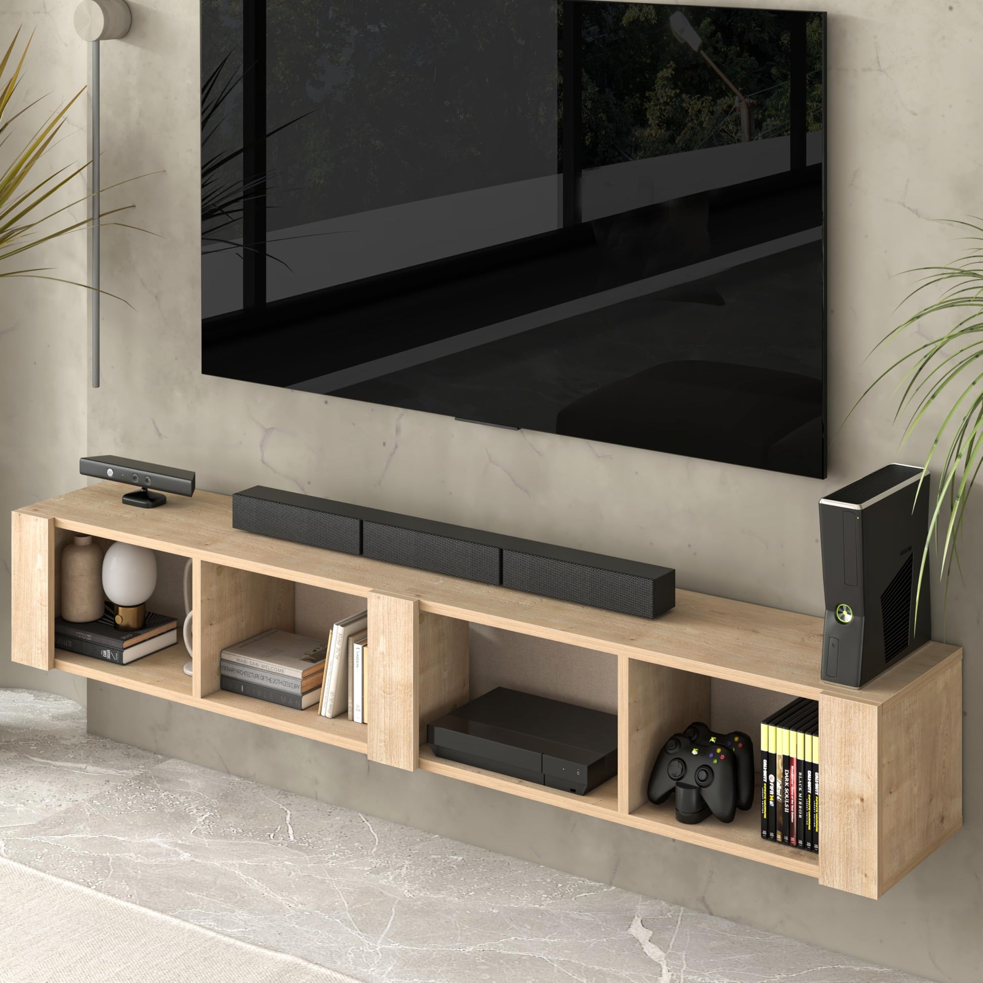 Upgrade your entertainment space with the Aven Floating TV Stand, a stylish and functional wall-mounted media console designed to complement modern living spaces. With its floating design, this sleek TV stand saves floor space while providing ample storage with four open shelves—perfect for organizing your media devices, gaming consoles, books, and decorative items. Crafted from high-quality engineered wood, the Aven Floating TV Stand is available in **two sophisticated finishes—Oak and Walnut—**allowing you to match your home décor effortlessly. Designed to hold TVs up to 78 inches, this floating console is an ideal fit for large-screen setups in your living room, bedroom, or home theater. With built-in cable management, this wall-mounted entertainment center ensures a clutter-free, streamlined look, eliminating messy wires. Plus, assembly is a breeze with step-by-step instructions and a helpful video guide accessible via QR code. Whether you’re looking for a modern floating TV shelf, a space-saving TV console, or a stylish wall-mounted entertainment unit, the Aven Floating TV Stand by Uniqtrio is the perfect choice.